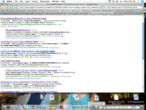 Thus far I have found my Tweener piece on nine other sites, a few of them actual newspapers even. I suppose it is silly to be so proud of something as my ramblings about middle-age and peri-menopause being filler on news sites and blogs, but it is something I wrote and that someone thought was good enough to bother offering to the world at large for review.